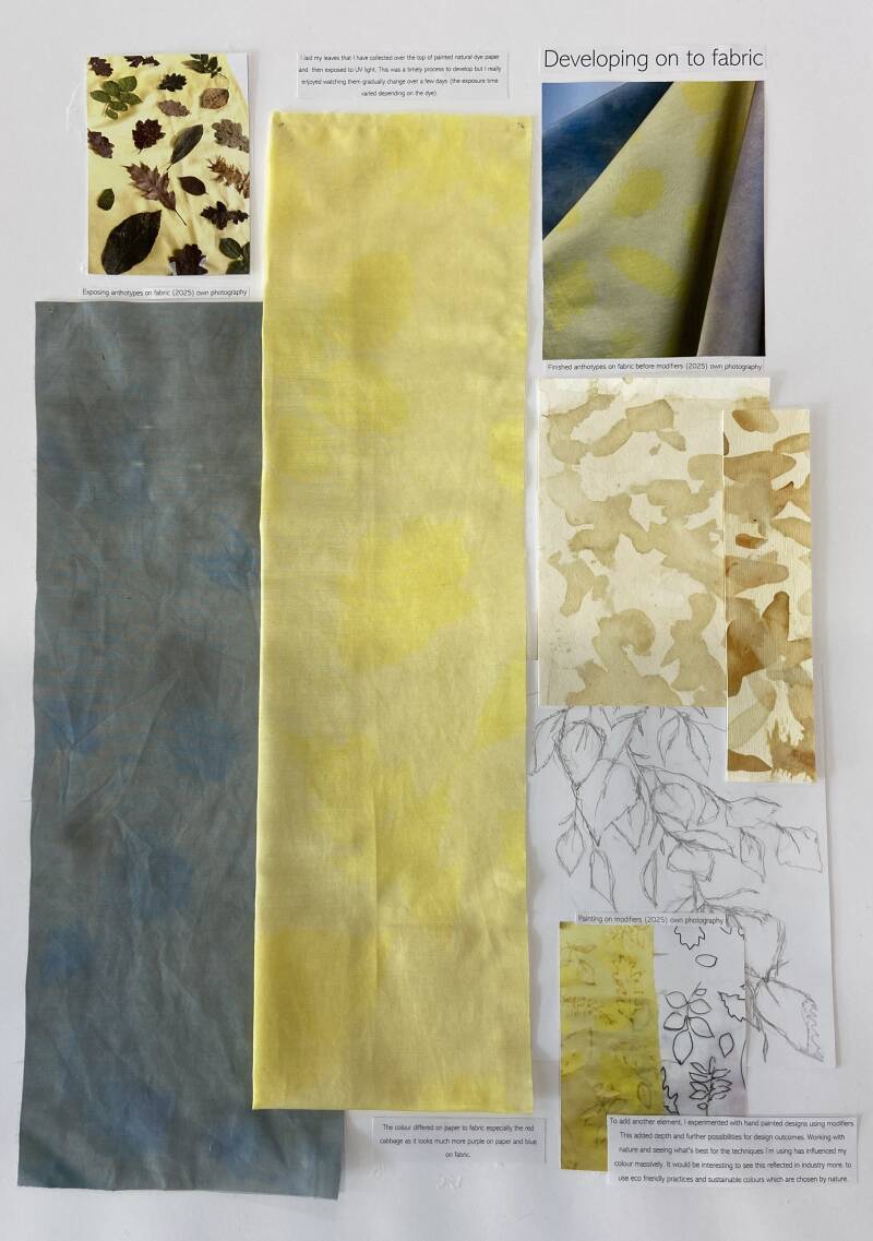 However I am aware of the unpredictability and colour fast issues to natural dyes, so in this project I decided to use this as a positive and create patterns by fading of colour to create patter. This led me to the anthotype technique (similar to cyanotypes but using natural colouring). I started with several experiments to see how I could combine this with my food waste dyes.